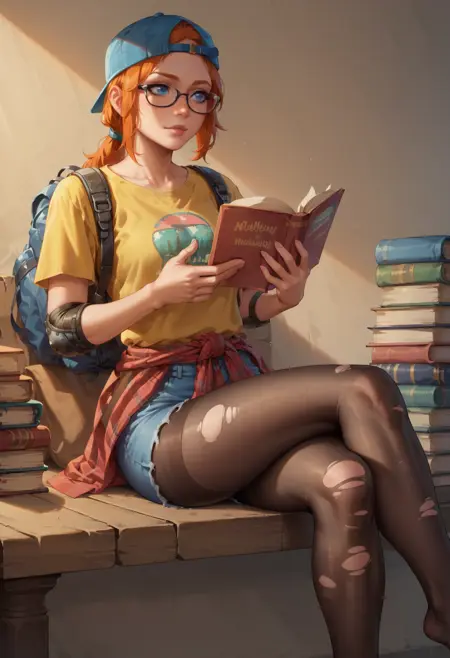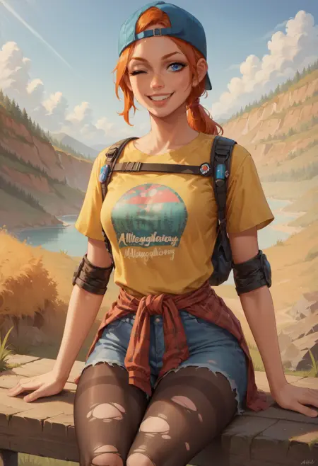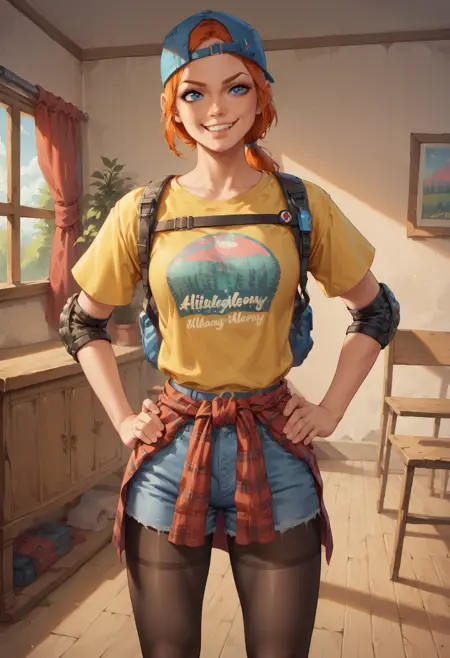 yellow shirt, short sleeves, hat, belt, torn pantyhose, backwards hat, elbow pads, clothes around waist, backpack