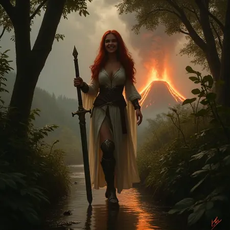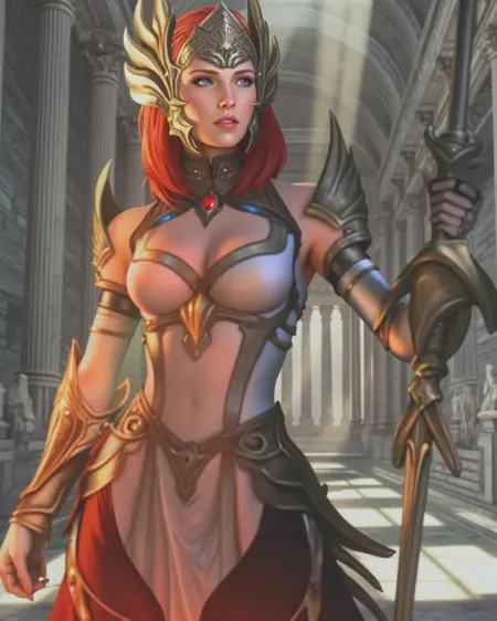 In the SD1.5 versions, she wears pauldrons more frequently along with her gauntlets, bracers and greaves. She's more likely to have bare shoulders and legs from SDXL to Flux. She learned most of her "action oriented" poses after SDXL 1.0, so if you'd like to have her in more "confrontational" images, I'd use Pony or Illustrious:
