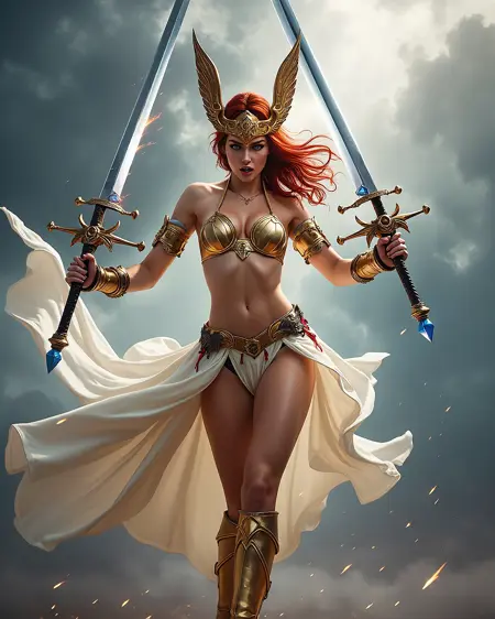 프롬프트에서 그녀의 헬멧을 언급하지 않으면, 금빛 날개 모양의 머리핀이나 날개가 달린 금빛 환관을 쓰는 경우가 많다. 그녀는 항상 푸른 대검을 들고 다니지는 않지만, 만약 언급하면 그게 무엇인지 알아챈다.