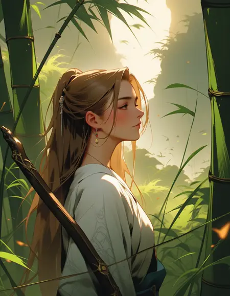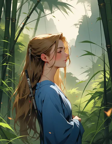 "description": "A soft breeze rustling through the leaves, creating a sense of peaceful connection with nature and complementing the woman robot's ethereal presence",