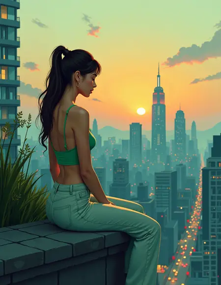 "description": "The central figure of the scene, possibly a woman standing in the middle of the setting. Her physical appearance, posture, and interaction with the environment are key focal points. Her positioning influences the placement of other elements in the scene.",
