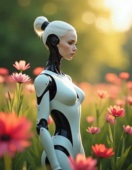 "description": "Delicate flowers surrounding the woman robot's head and shoulders, their colors contrasting beautifully with her stark white hair",