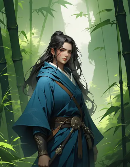 "description": "The background includes landscape elements like trees or buildings that surround the central figure. The environmental effects such as fog or sunlight contribute to the overall mood.",