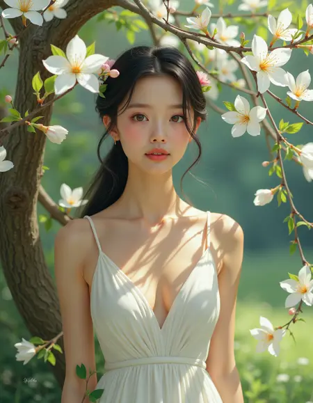 "description": "A similar tree growing to the woman robot's right, its branches stretching towards her, harmonizing with the serene atmosphere",
