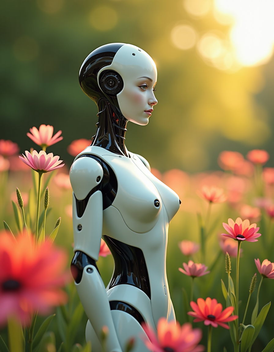 "description": "Delicate flowers surrounding the woman robot's head and shoulders",