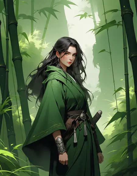 "description": "背景包括环绕中心人物的景观元素,如树木或建筑。雾气或阳光等环境效果有助于整体氛围营造。",