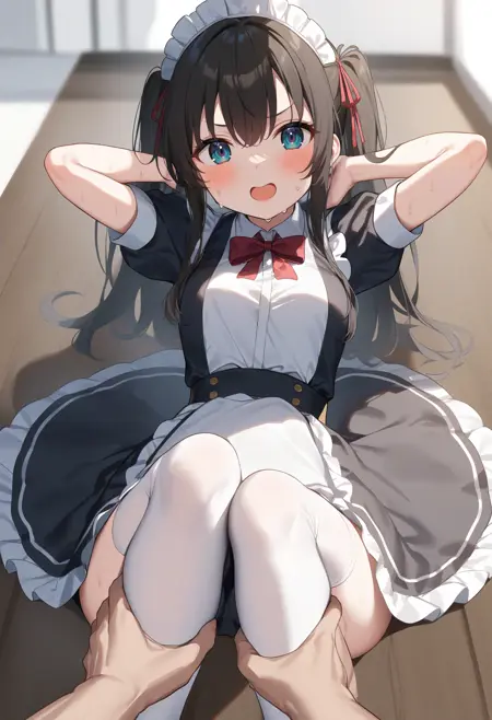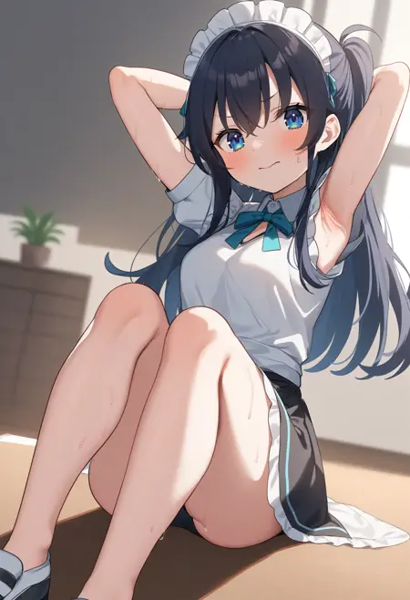 元々プロンプトだけでそれっぽく出せますが腹筋に見えるよう矯正します。 sit-up, arms behind head, arms up, sweat, sitting, armpits, exercise, knees up, sweatdrop, thighs 辺りからお好みのを入れていただき、足を押さえてあげたい場合は pov hands, leg grab, ankle grab, holding another's foot も追加して下さい。