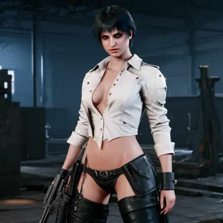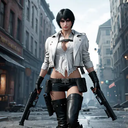 lora:_**_dmc5lady\_SDXL\_SGX_**_:0.9(dmc5lady woman),3d as a video game character,(heterochromia),1girl,a woman in an (unbuttoned and open white shirt:1.2), (medium breasts:1.3),(exposed cleavage:1.2),with short black hair,wearing thigh_high boots,(wearing black chaps:1.3),wielding a weapon gun missile launcher,standing on a desolate city street,(full body:1.3),(wide shot:1.3)