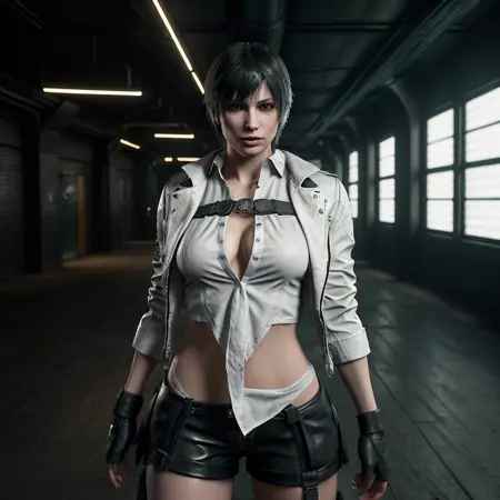 lora:_**_dmc5lady\_SD15\_SGX_**_:0.9(dmc5lady woman),3d as a video game character,(heterochromia),1girl,a woman in an (unbuttoned and open white shirt:1.2), (medium breasts:1.3),(exposed cleavage:1.2),with short black hair,wearing thigh_high boots,(wearing black chaps:1.3),wielding a weapon gun missile launcher,standing on a desolate city street,(full body:1.3),(wide shot:1.3)