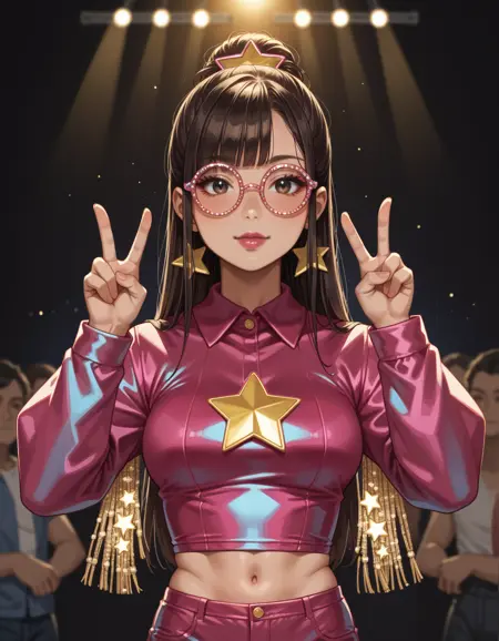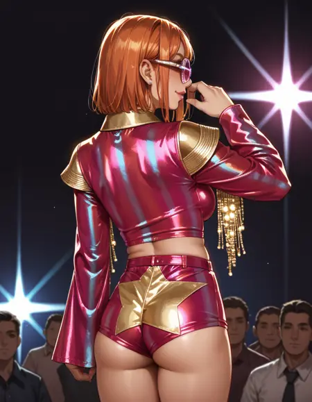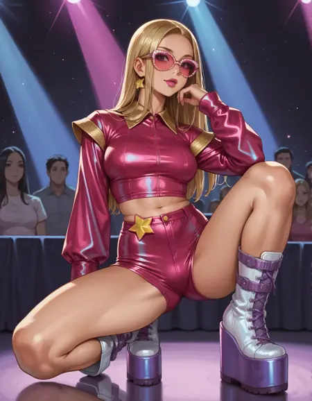 키워드: hud_z1ggysd, 분홍색 선글라스, 화려한 무지개색, 크롭탑, 긴 소매, 허리 부분, 반바지, 별(기호)