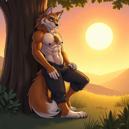 선택적 프롬프트: 빛나는 햇빛, 상의 벗음, 나무에 기대기, 일몰, 야외