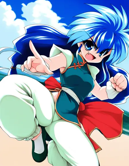 PC-98のエロ格闘ゲーム『The Queen of Duellist』より、龍鳳ちゃんのLoRAです。水色の髪に、後ろで束ねた青い三つ編みポニーテールが特徴の拳法ガール。