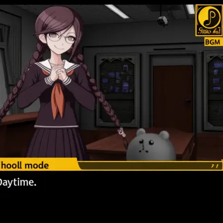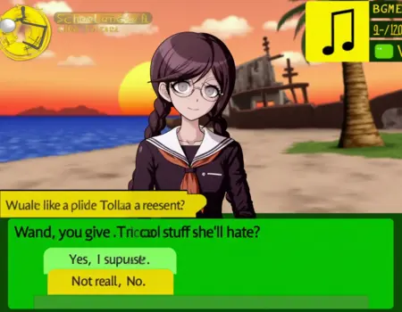 "Toko Fukawa는 Danganronpa 1의 표준 해적 스타일 유니폼을 입고 있습니다. 안경을 착용하고 있습니다. Toko는 보라색 머리카락을 땋아 뒤로 묶었고, 카메라를 바라보고 있습니다. 이 이미지는 Danganronpa 1의 스크린샷으로, danganronpa sprite style 및 danganronpa 1 GUI 스크린샷 스타일을 적용했습니다. 장면은 일몰 시 해변으로, 오른쪽 끝에 단 하나의 야자수와 물속에 가라앉은 해적선의 폐허가 있습니다. 상단에는 학교 모드 설정이 보입니다. 텍스트는 노란 원과 흰색 미소 얼굴 옆에 'School mode'라고 쓰여 있고, 원 옆에는 'Sunset'이라고 적혀 있습니다. 오른쪽 상단에는 노란 GUI 박스가 있으며, 그 안에는 음표, 검은색으로 'BGM', 볼륨이 최대치인 볼륨 바가 있습니다. 배경 하단에는 녹색 메시지가 'Would you like to give Toko a present?'라고 적혀 있습니다. 전경에는 두 개의 노란 박스가 있습니다. 상단 박스에는 흰색 텍스트로 'Sure, I suppose.'가, 하단 박스에는 흰색 텍스트로 'Nah'가 적혀 있습니다. 이는 danganronpa sprite style과 danganronpa 1 GUI 스크린샷 스타일을 적용한 Danganronpa 1의 스크린샷입니다. 텍스트 박스: ''Want to give Toko cool stuff she'll hate?'', 선택 박스: ''Sure, I suppose', 'Nah'', 모드 텍스트: ''SCHOOL MODE'', 시간 텍스트: ''SUNSET'', 선택 박스 색상: ''yellow, grey'', 텍스트 박스 색상: ''white, black''."