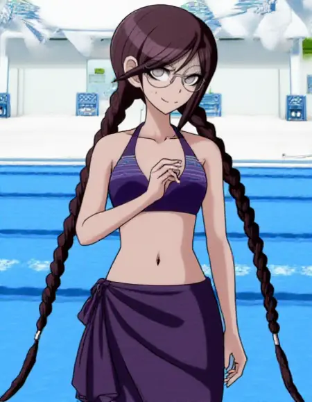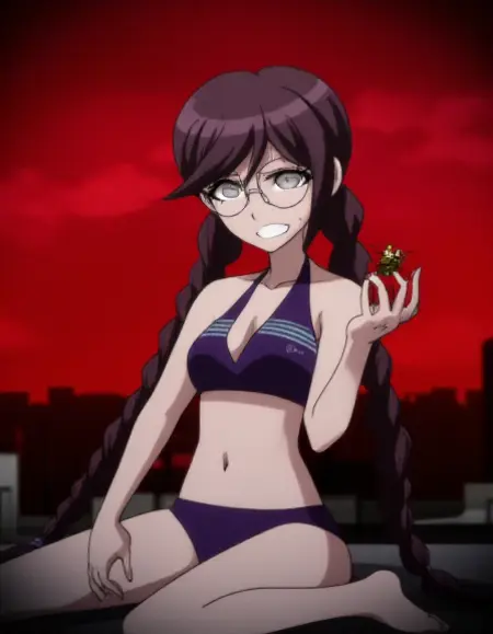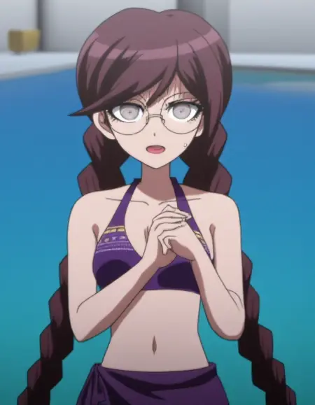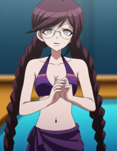 "Toko Fukawa는 Danganronpa S의 수영복을 입고 있습니다. 수영복은 보라색 비키니 상의로, 목 뒤에서 매듭을 지는 할터 스타일입니다. 하의는 보라색 워프 스타일입니다. Toko는 긴 어두운 보라색 머리카락을 뒷쪽에 두 줄로 땋아두고, 회색 눈, 큰 원형 와이어 프레임 안경을 착용하고 있습니다."