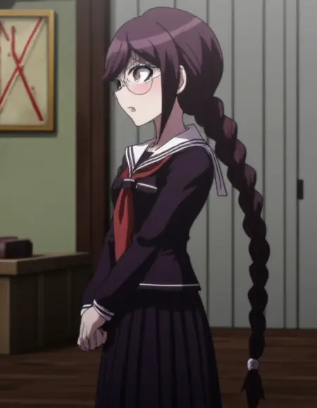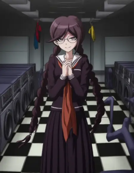"Toko Fukawa는 Danganronpa 1의 유니폼을 입고 있으며, 스커트는 발목 길이입니다. 그녀는 어두운 보라색 해적 스타일 유니폼, 흰색 칼라 셔츠, 빨간 넥리본을 착용하고 있습니다."