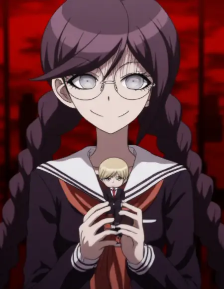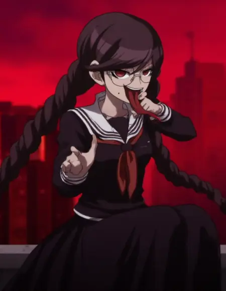 "Genocider Sho는 Danganronpa 1의 유니폼을 입고 있으며, 스커트는 발목 길이입니다. 그녀는 어두운 보라색 해적 스타일 유니폼, 흰색 칼라 셔츠, 빨간 넥리본을 착용하고 있습니다. 양손에 각각 한 쌍의 은색 가위를 들고 있으며, 혀를 내밀고 붉게 빛나는 눈으로 위협적인 미소를 짓고 있습니다."