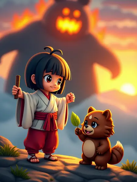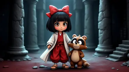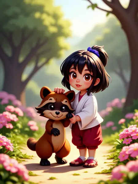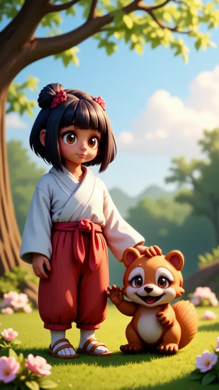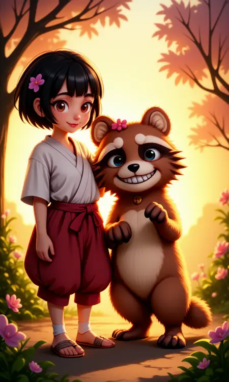 PockySNES_and_RockySNES, 1girl, 1raccoon_dog, 黑发, 棕色毛皮, 白色长袍, 宽松的红色长裤, 棕色眼睛, 白色眼白, 黑色瞳孔, 草鞋, 脚, 袜子, 手持 ōnusa, 奔跑, 张嘴, 眨眼, 鞠躬, PockySNES_and_RockySNES 沿着日本庭院小径奔跑,