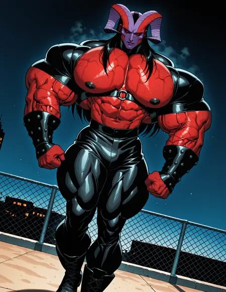 触发词:亵渎、紧身衣、红皮肤、角、无眉毛、黑色乳头、皮带、红眼睛、黑发、长发、无胡须、护臂、皮裤、战斗靴
