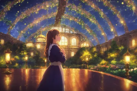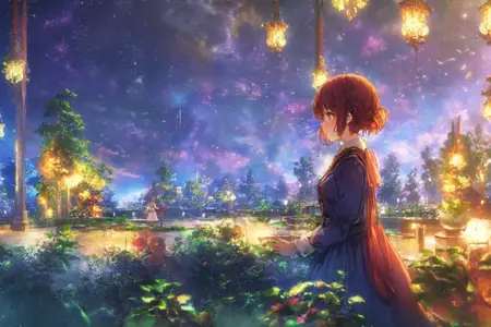 프롬프트: 1girl, (masterpiece,best quality:1.6), scenery, night sky, open sky, stars, star light, milky way, starry sky, black_skirt, black shoes, full_body, green_eyes, necktie, pleated_skirt, dark blue hair, school_uniform, short_hair, short_sleeves, sweater_vest, white_shirt, short red hair, full body, standing,lora:VioletEvergarden1.0:0.8
