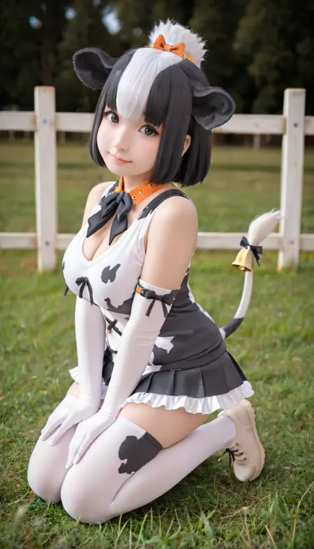 [기본 복장] hofr1st, 동물 무늬, 소 무늬, 셔츠, 소매 없는 셔츠, 소매 없음, 무늬 셔츠, 이색 셔츠, 흰 셔츠, 젖가슴, 장갑, 팔꿈치 장갑, 흰 장갑, 무늬 장갑, 종, 리본, 넥타이, 검은 리본, 검은 넥타이, 주황 리본, 치마, 미니스커트, 주름 치마, 프릴 치마, 프릴, 무늬 치마, 검은 치마, 허벅지 스타킹, 무늬 허벅지 스타킹, 흰 허벅지 스타킹, 신발, 운동화,