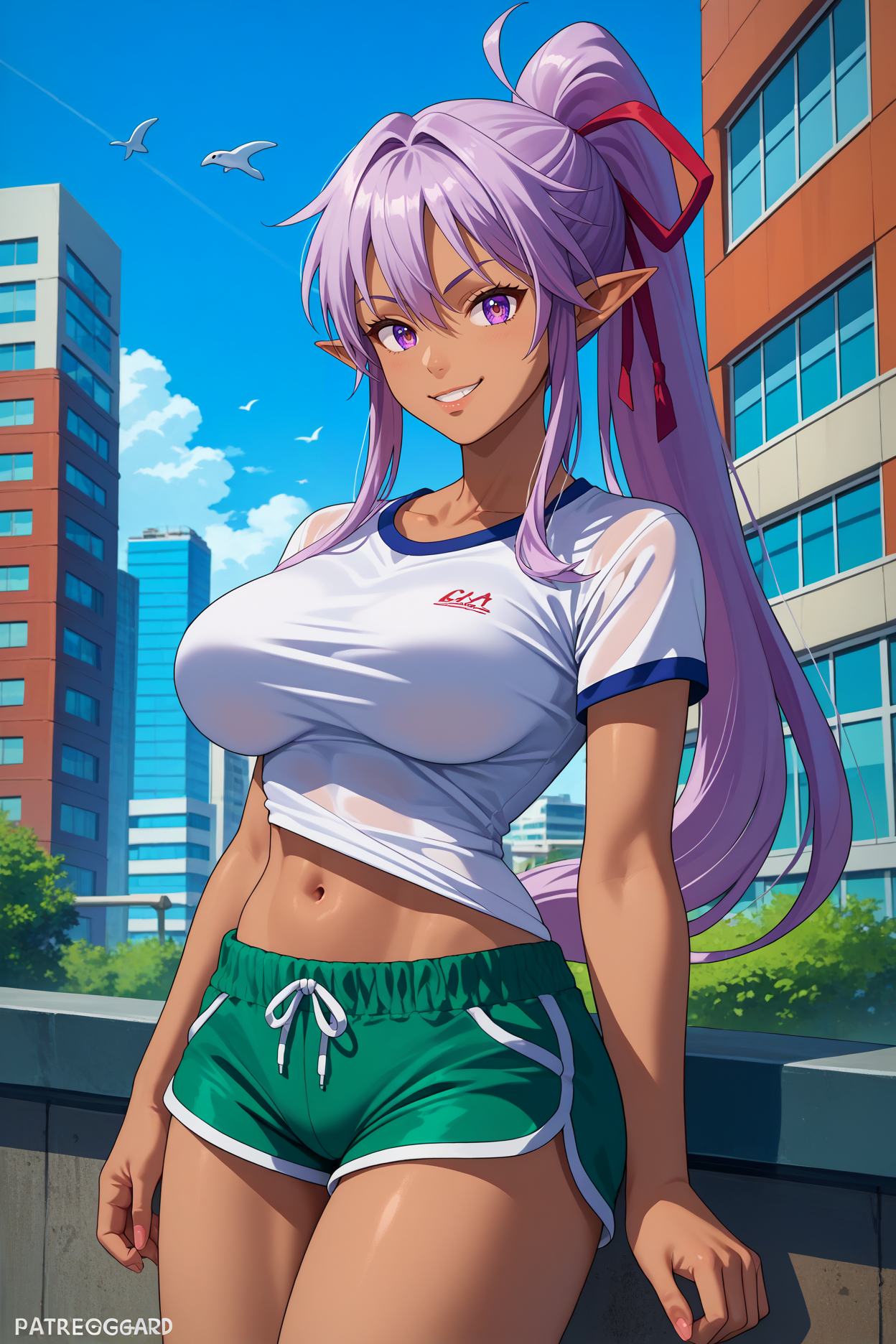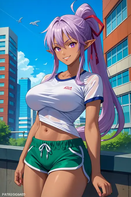 트리거 단어는 "aisha udgard"이며, "검은 피부를 가진 여성, 뾰족한 귀, 높은 단발, 자주색 머리, 눈 사이의 머리카락, 보라색 눈"이 필수입니다.