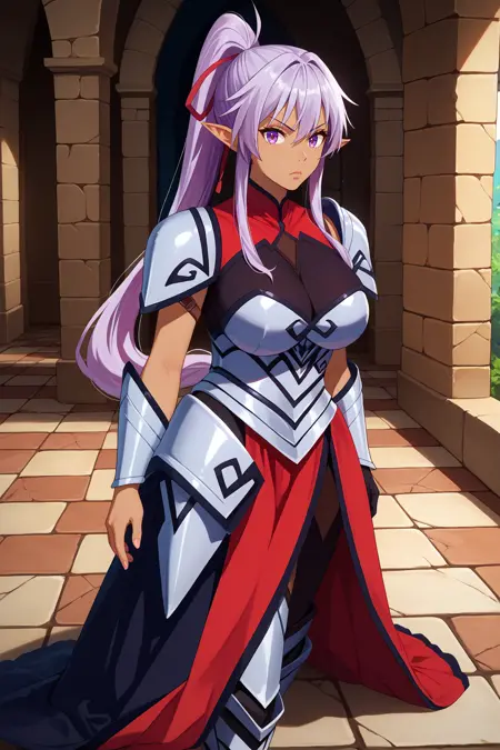 그녀의 전형적인 외모를 위해 "머리리본, 빨간 리본, 갑옷, 갑옷 드레스, 한쪽 어깨 파드, 빨간색과 검은색 드레스, 갑옷 부츠, 팔 보호대"를 추가하세요.