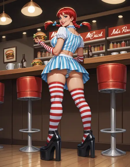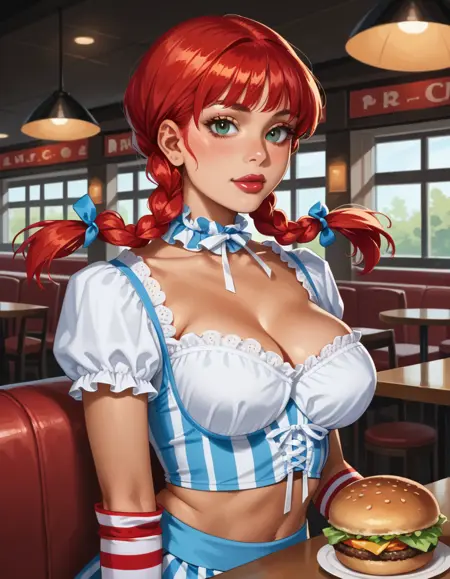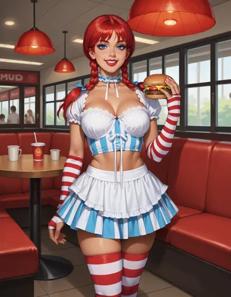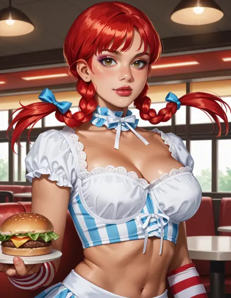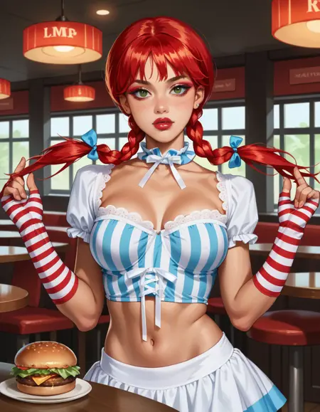 For Wendy: 1girl, makeup, lipstick, large breasts, red hair, blue eyes, twin braids, hud_brgrb4be, choker, striped, crop top, midriff, skirt, fingerless elbow gloves, upper body, restaurant, burger, looking at viewer,