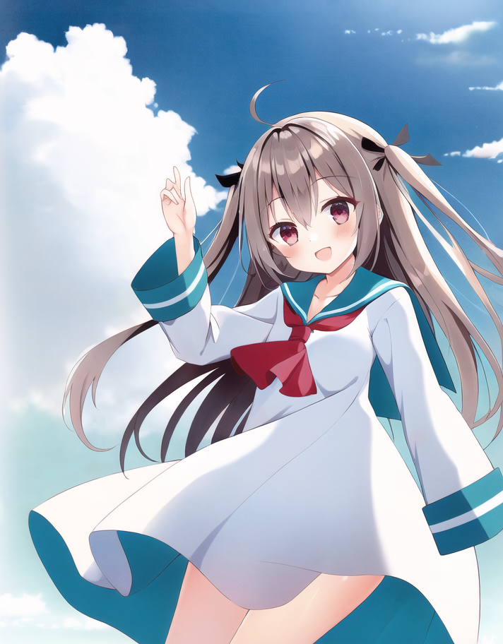 水手服:亚托莉,1个女孩,单独,长发,脸红,红眼睛,刘海,白色水手服,蓝色水手领,浅棕色头发,黑色发带,红色领结,宽袖,头发遮住眼睛,鞋子,