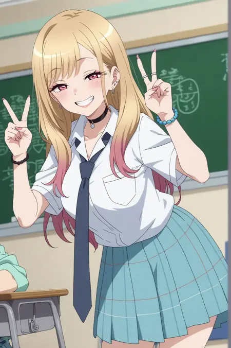트리거: 옷 1: 마린 키타가와, 성숙한, 앞머리, 초커, 셔츠, 피어싱, 귀 피어싱, 귀걸이, 다색 머리, 가슴, 넥타이, 학교 유니폼, 치마