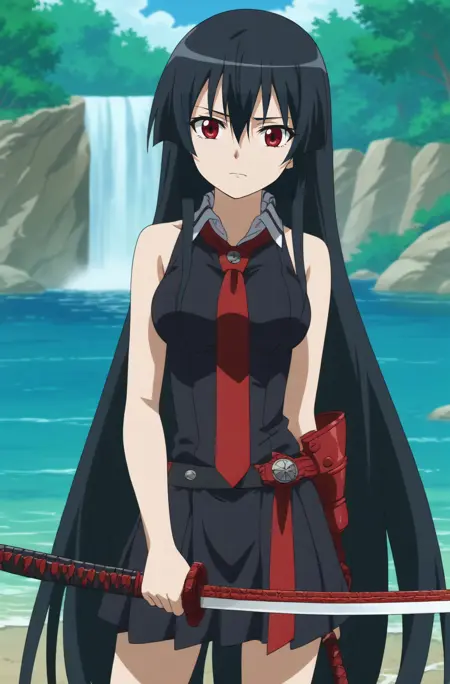 Triggers : akame,long hair,necktie,sleeveless,red necktie,bare shoulders,hime cut,very long hair,