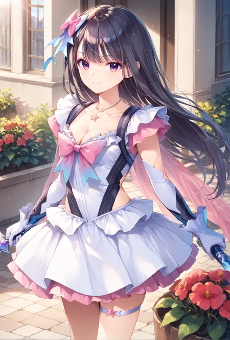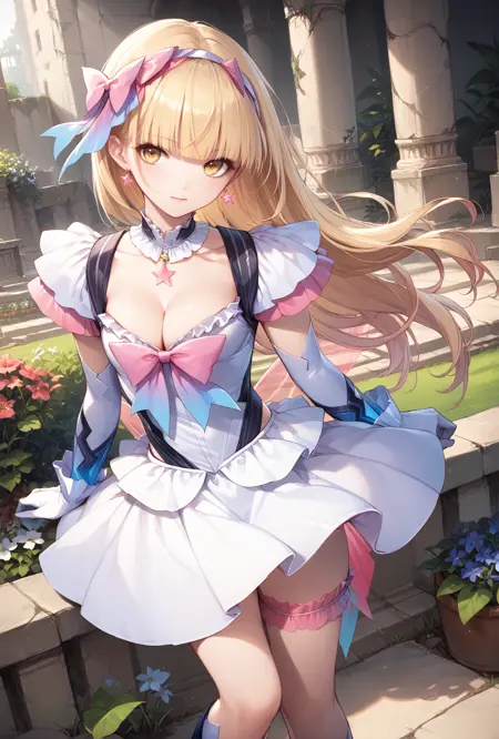 스커트, 드레스, 마법의 소녀, 프릴, 허벅지 스트랩, 헤어 리본, 팔꿈치 장갑, 보석, 목걸이, 가슴 선,