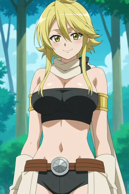 触发词:leone、胸部、乳沟、微笑、黄眼睛、围巾、侧发、裸露肩膀、头发间于眼睛、腹部、肚脐