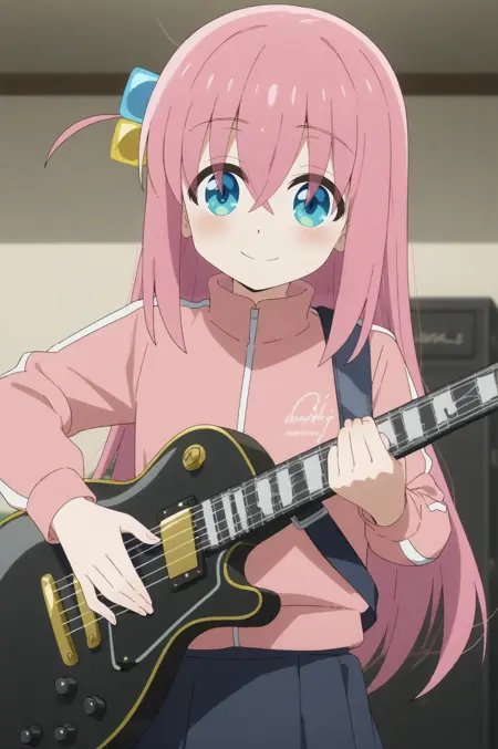 Triggers : hitori gotoh,bangs,hair between eyes,jacket,cube hair ornament,hair ornament,track jacket,pink jacket,skirt