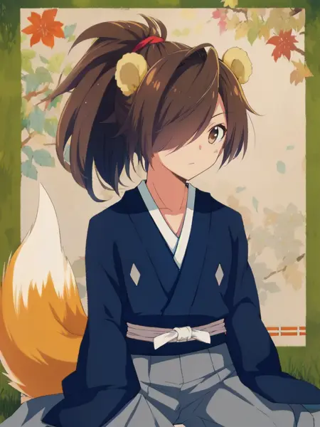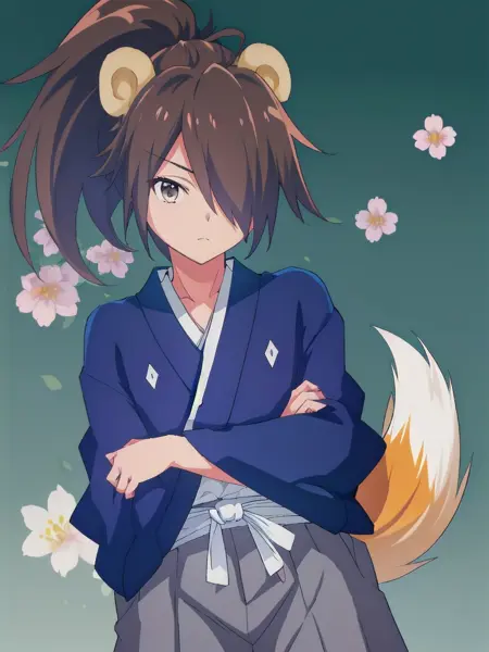japanese clothes, blue shirt, belt, gray pants, sleeves past wrists