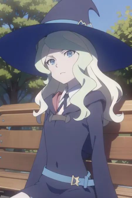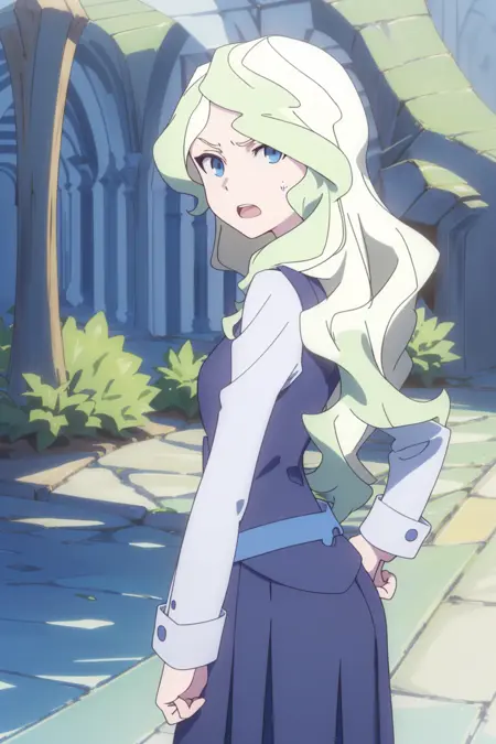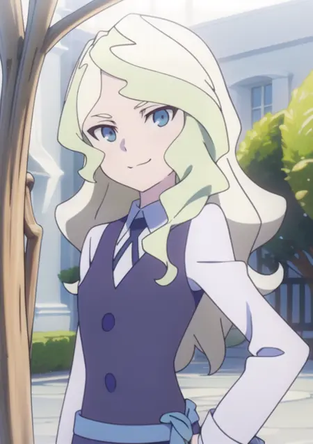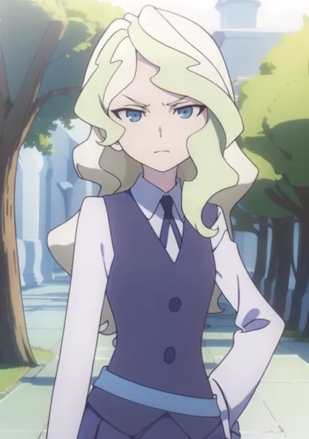 ( 1girl, diana, 小さな頭, 青く傾いた目, 薄緑色と金髪、マルチカラーの髪、波状の長い髪、中くらいの胸、細身の体、細い脚、身長160cm ),( 学校の制服、学校用のベスト、白い長袖シャツ、リボンネクタイ、左側に結び目のあるウエストストラップ、長いスカート )