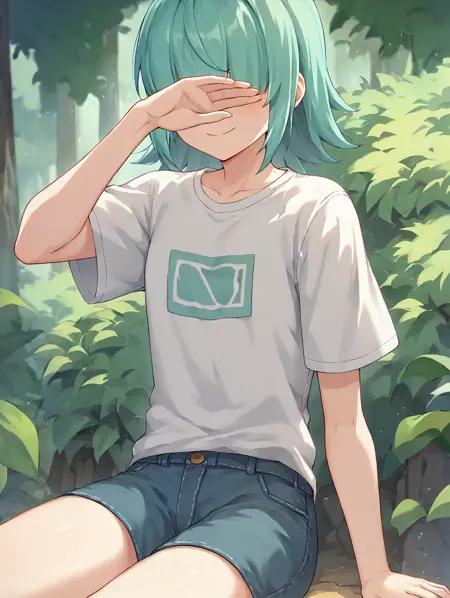 - futabaaoibase, 中长发, 齐刘海, 水蓝色头发, 绿色头发, 遮住眼睛, futabaaoidef, 蓝色短裤, 水蓝色夹克, 白色上衣, 夹克搭在肩上,