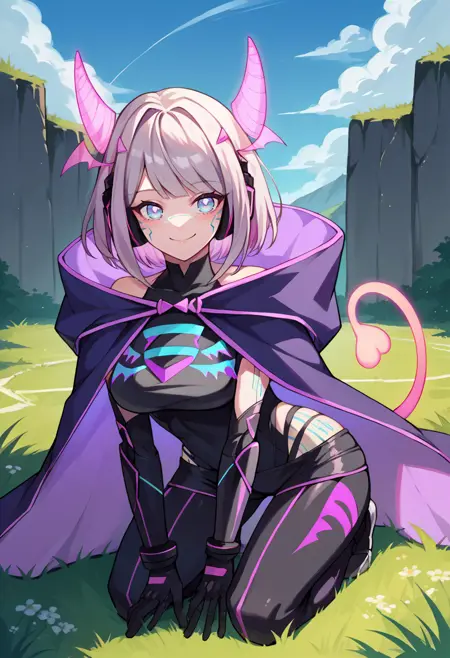 MotherV3, short hair, multicolored eyes, pink horns, head wings, facial mark, headphones, black bodysuit, neon trim, hip vent, black elbow gloves, purple cape, tail