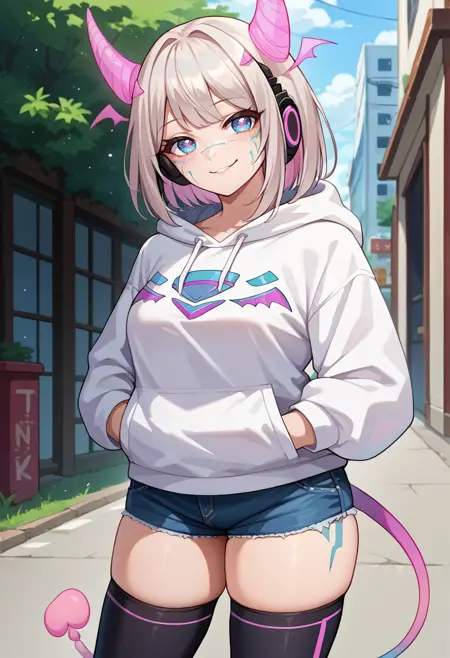 MotherV3, short hair, multicolored eyes, pink horns, head wings, facial mark, headphones, tail