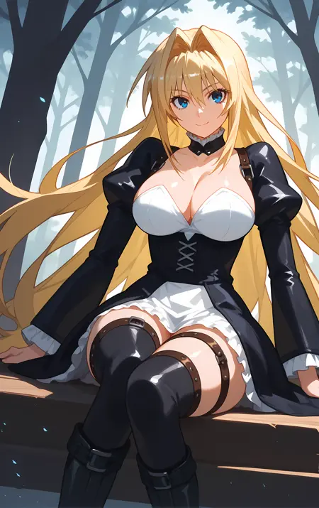 服装 → black_thighhighs, boots, choker, cleavage, dress, knee_boots, long_sleeves, skirt, thigh_strap, thighhighs, zettai_ryouiki,