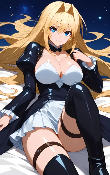 外观 → ohwx, 1girl, breasts, blonde_hair, blue_eyes, solo, cleavage, long_hair, large_breasts,