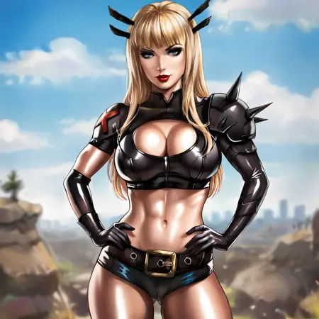 - 触发词:MagikMarvel, 1girl, 大胸, 黑色过膝袜, 金发, 露脐, 长发, 露胸剪裁, 肚脐, 短裤, 黑色手套, 尖刺, 腰带, 嘴唇, 刘海, 蓝眼, 有肌肉, 黑色短裤, 露脐上衣, 肩甲, 双手叉腰
