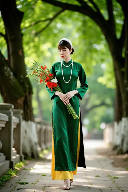 伝統的なベトナムのアオザイ:「静かな表情の女性が、濃い緑色の伝統的なアオザイを着て、柔らかな自然の緑に囲まれて優雅に立っている。両手には鮮やかな赤色のカーネーションの花束を抱え、目を優しく下に向ける。髪は低めのバングスタイルで、明るい色のヘアバンドで飾られている。長く珠のネックレスを着けており、洗練された衣装と調和している。照明は柔らかく自然で、穏やかで内省的な雰囲気をより一層引き立てる優しい影を落としている。」