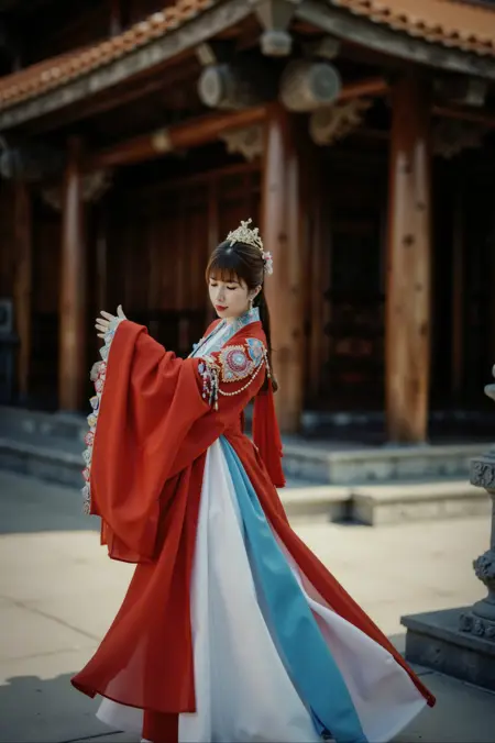 ハノイガール、古代、伝統的な中国の漢服を着た女性が、歴史的な寺院の階段に優雅に立っている。彼女は繊細な刺繍が施され、大きな傘を手に持ち、柔らかな日差しを部分的に遮っている。髪は豪華な簪や房で飾られ、赤と青の着物と調和している。寺院の石彫りや柱には龍のモチーフが刻まれており、文化的な豊かさを添えている。夕陽の温かい光が、女性が深く思索に耽っている様子をより一層際立たせ、優雅さと伝統を体現している。