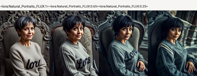 自然なポートレート写真の作成を助け、特にクローズアップ撮影で効果的です(重みを実験してください。開発版およびSchnell FLUXバージョンでは0.5-1から始めることをお勧めしますが、0.2のような低い重みでも望ましい効果をもたらすことがあります)。目的は、顔に細部と生き生きとした雰囲気を加え、スタジオ風のプラスチック調または過剰に補正された画像(特にFLUX Schnellはこのような画像を生成しやすい)を避けることです。トリガーは不要ですが、以下の言葉が役立つ場合があります:自然なポートレート、クローズアップ、リアルな生活の挿入、視線を逸らす、見上げる、横から、年配、高齢者、しわのある肌、現実的、照明スタイル