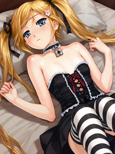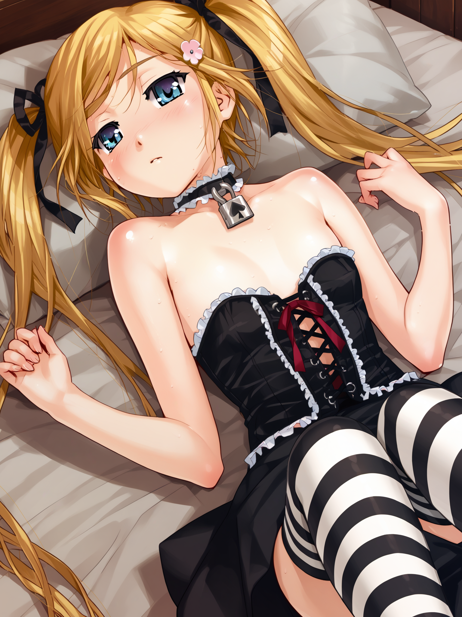 corset, black dress, black skirt, black thighhighs, striped thighhighs, choker, padlocked collar, bare shoulders블랙 카미솔: