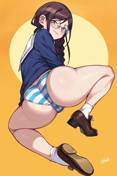 プロンプト: fukawa toko、ツインブラids、長い髪、女子生徒の制服、紺色のシャツ、茶色の靴、丸眼鏡、セーラー collar、無枠眼鏡、茶色の髪