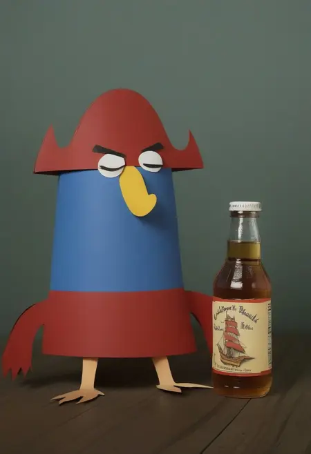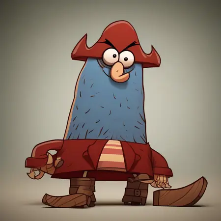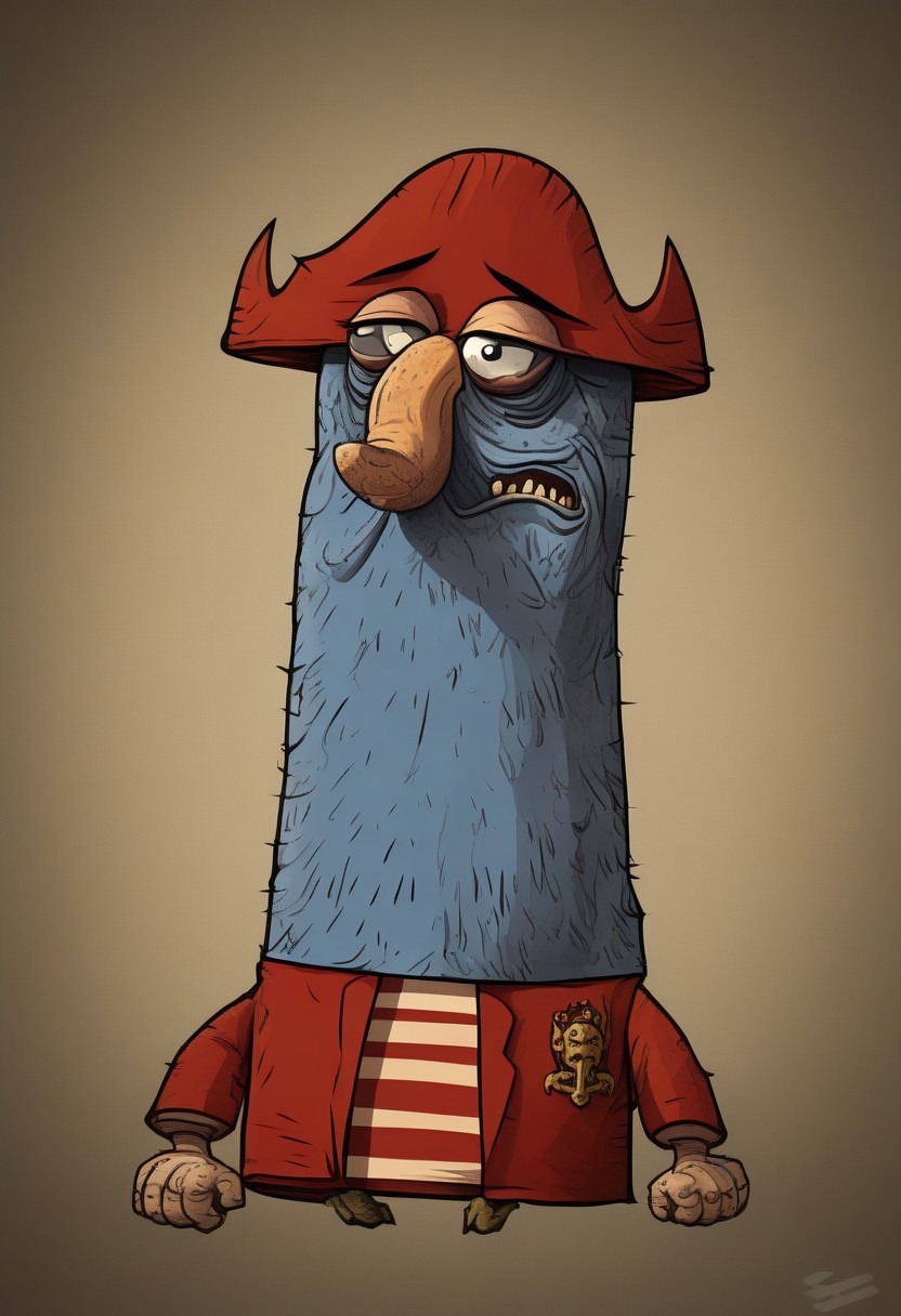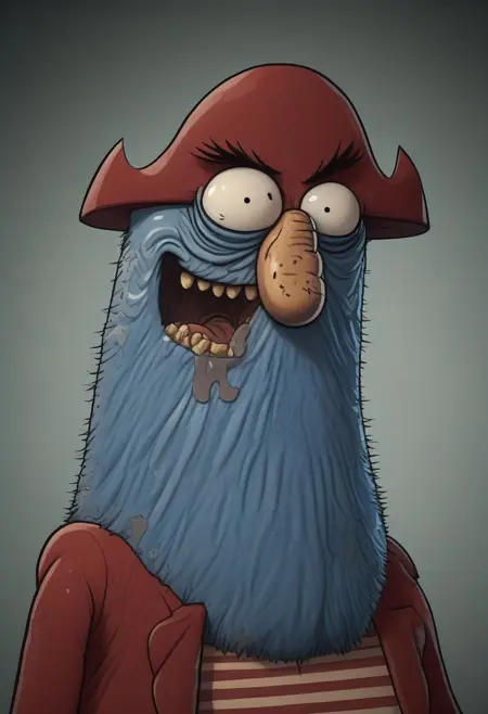 (特写肖像镜头:1.3),K’nuckles船长,戴着红色海盗帽、红色海盗外套、条纹衬衫,(蓝色皮肤:1.3),木制义肢,(木制双手:1.2),超精细,皱眉,满身汗水,沾满黏糊糊的糖浆,胡茬,苍蝇,黄眼睛,皱纹脸,臭气线,流口水
