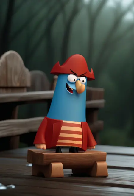 标签:K’nuckles船长、蓝色皮肤、木制双手、红色海盗帽、红色海盗外套、条纹衬衫、木制义肢、特写