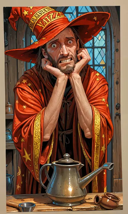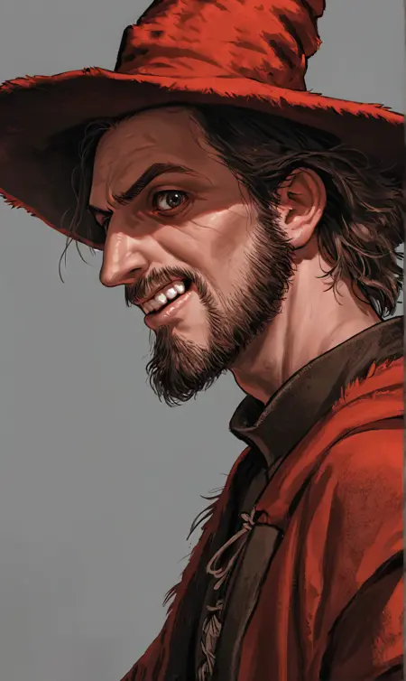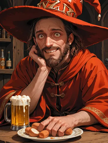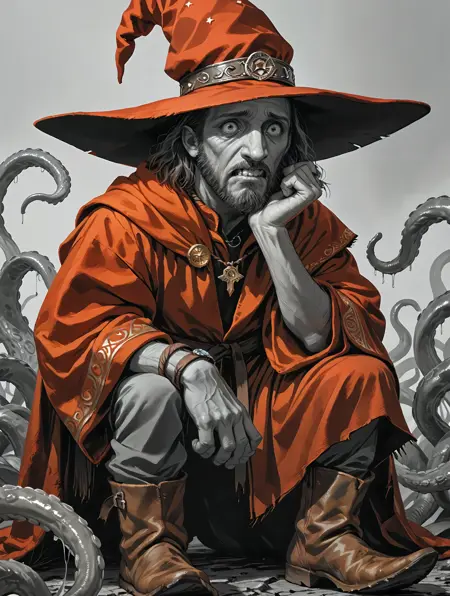 rincewind, wizard, male focus, red robe, wizard hat, beard, brown hair