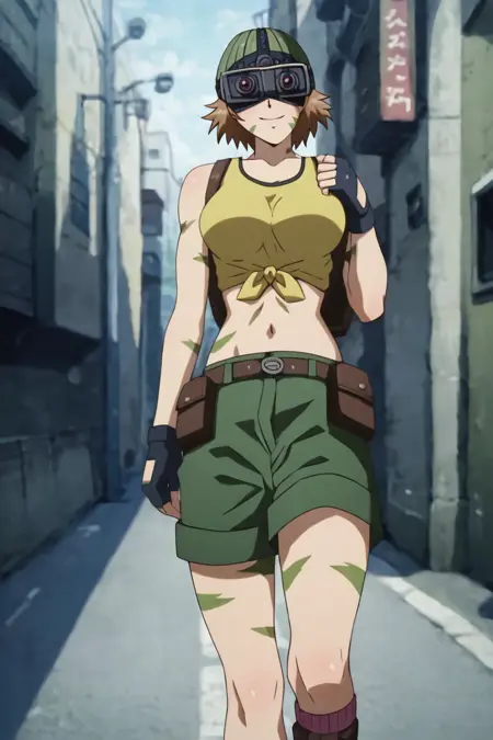 プロンプト 1 : 亜田トコ、ショートヘア、茶色の髪、胸、傷跡、緑の帽子、ゴーグル、ゴーグルを頭に載せた状態、結んだシャツ、お腹、へそ、緑のショーツ
